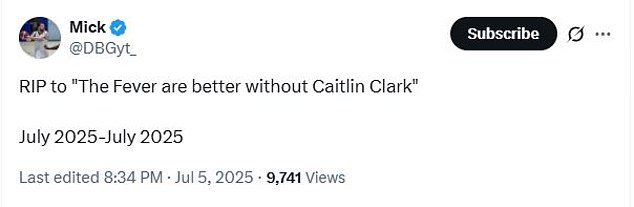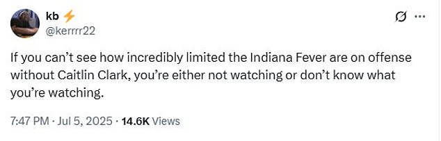 “RIP to” The Fever je bolja bez Caitlin Clark “srpnja 2025.-srpanj 2025.”, izjavio je drugi Clarkov navijač.