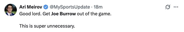 Još jedan NFL novinar, Ari Meirov, dodao je: ‘Dobar Gospodine. Izvadite Joea Burrowa iz igre. Ovo je super nepotrebno. ‘