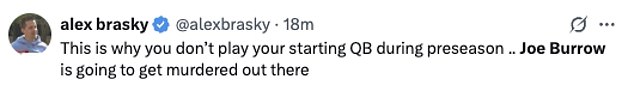 “Zbog toga ne igrate svoj početni QB tijekom predsezona … Joe Burrow će biti ubijen vani”, rekao je jedan navijač Bengalsa.