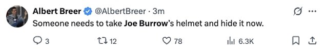 Novinar NFL -a Albert Bree objavio je: “Netko treba uzeti kacigu Joea Burrowa i sakriti je sada.”