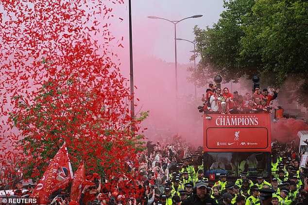 Kako je sve više i više obožavatelja stiglo, Alexander-Arnold je viđen kako je ustao s rukama na stražnjem dijelu autobusa, a Dominik Szoboslai, vlažna kosa srušila mu se po licu, držeći trofej na napuhavanje.