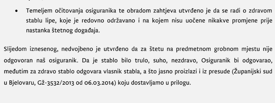 “Naš osiguranik, društvo Zagrebački Holding d.o.o.- podružnica Gradska groblja, nije vlasnik parcele (zemljišta) na kojoj se nalazi stablo, a samim time niti vlasnik stabla, već je njemu samo povjereno održavanje stabla”. No, kako se stablo nalazi na groblju čiji je vlasnik Grad, a Holding i podružnica Gradska groblja u vlasništvu su Grada, tko je onda vlasnik stabla? Iz odbijenice proizlazi da stablo nema vlasnika.