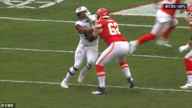 Dok je izlazio s terena, Thuney se može vidjeti kako se ispričava obrambenom igraču godine 2023.