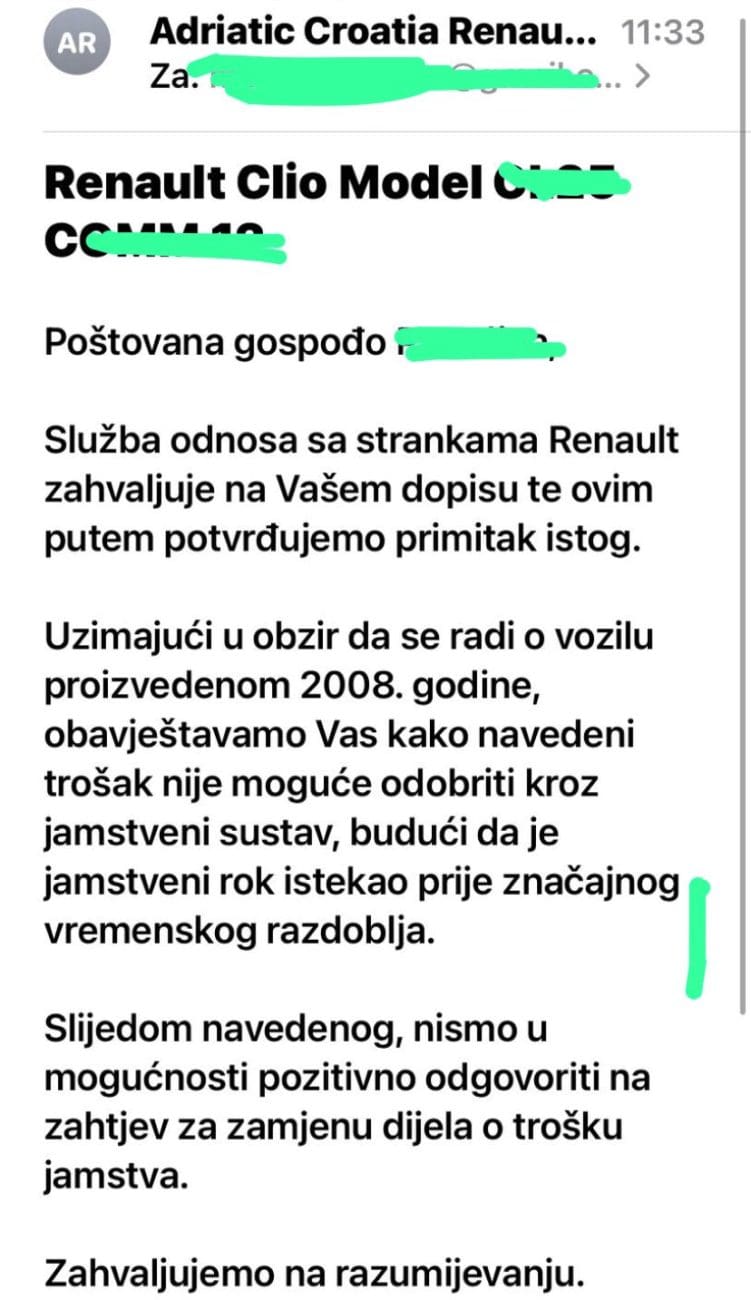 “Uzimajući u obzir da se radi o vozilu proizvedenom 2008. godine, obavještavamo Vas kako navedeni trošak nije moguće odobriti kroz jamstveni sustav, budući da je jamstveni rok istekao prije značajnog vremenskog razdoblja. Slijedom navedenog, nismo u mogućnosti pozitivno odgovoriti na zahtjev za zamjenu dijela o trošku jamstva.