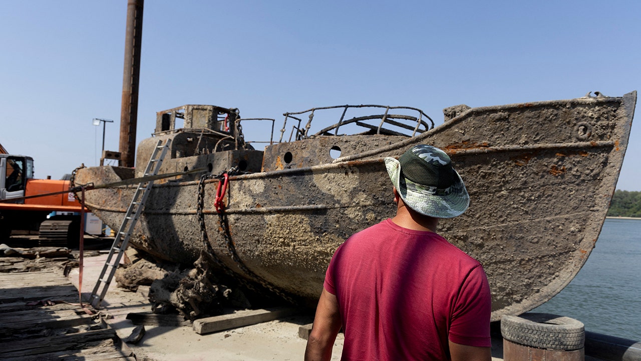 Ribar pregledava potopljeni njemački ratni brod iz Drugog svjetskog rata, nedavno izvađen iz rijeke Dunav nakon što je bio izložen zbog niske razine vode uzrokovane sušom i ekstremnom vrućinom, u Prahovu, Srbija, 5. rujna 2024. (REUTERS/Đorđe Kojadinović)