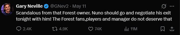Neville je napravio slalu kao odgovor na Forest -ov tvit nakon poraza od Evertona u travnju 2024