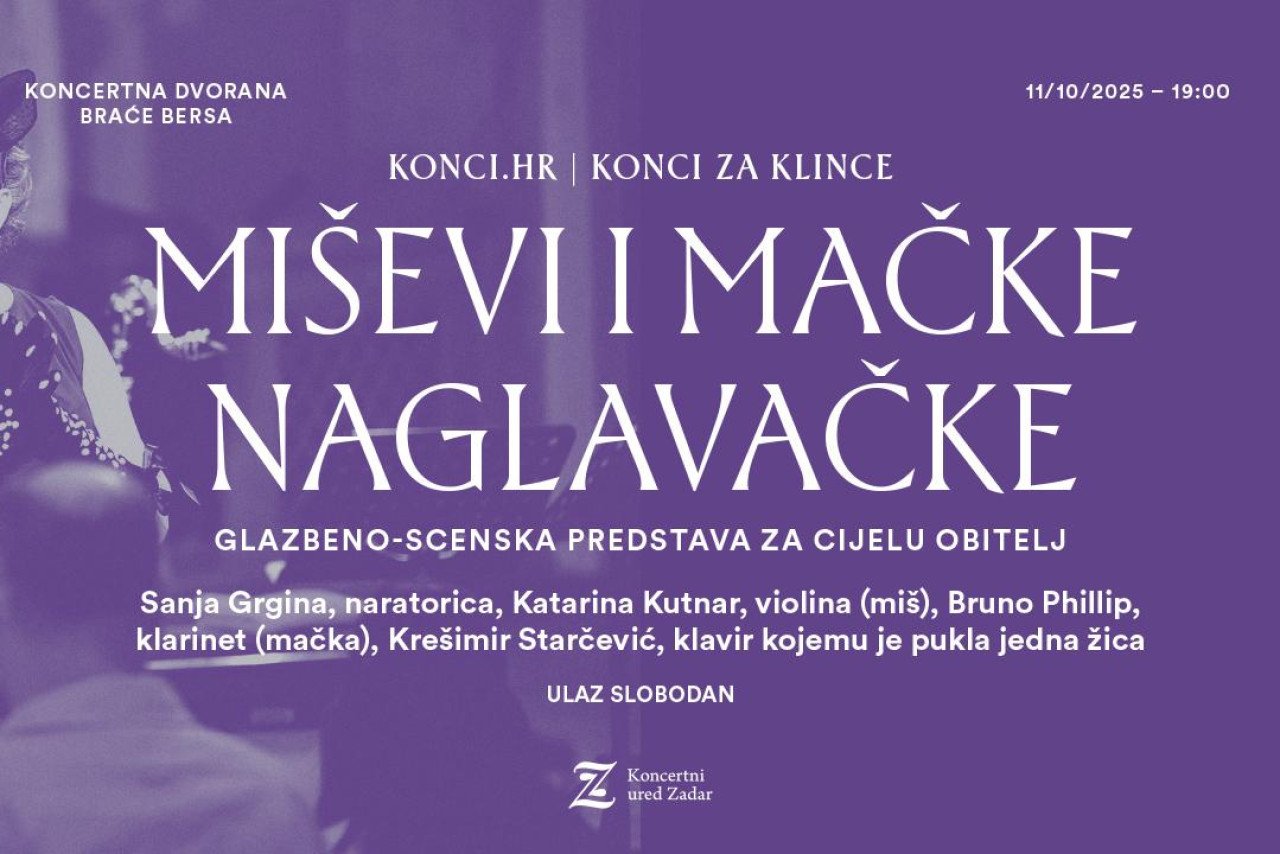 U subotu, 11. 10. s početkom u 19 sati u Koncertnoj dvorani braće Bersa u Kneževoj palači održat će se glazbeno-scenska predstava Miševi i mačke naglavačke. Predstavu izvode Sanja Grgina u ulozi naratorice, violinistica Katarina Kutnar u ulozi miša, klarinetist Bruno Phillip u ulozi mačka te pijanist Krešimir Starčević. Program se provodi u suradnji s Hrvatskom udrugom glazbenih organizatora kao dio projekta razvoja publike Konci za klince.