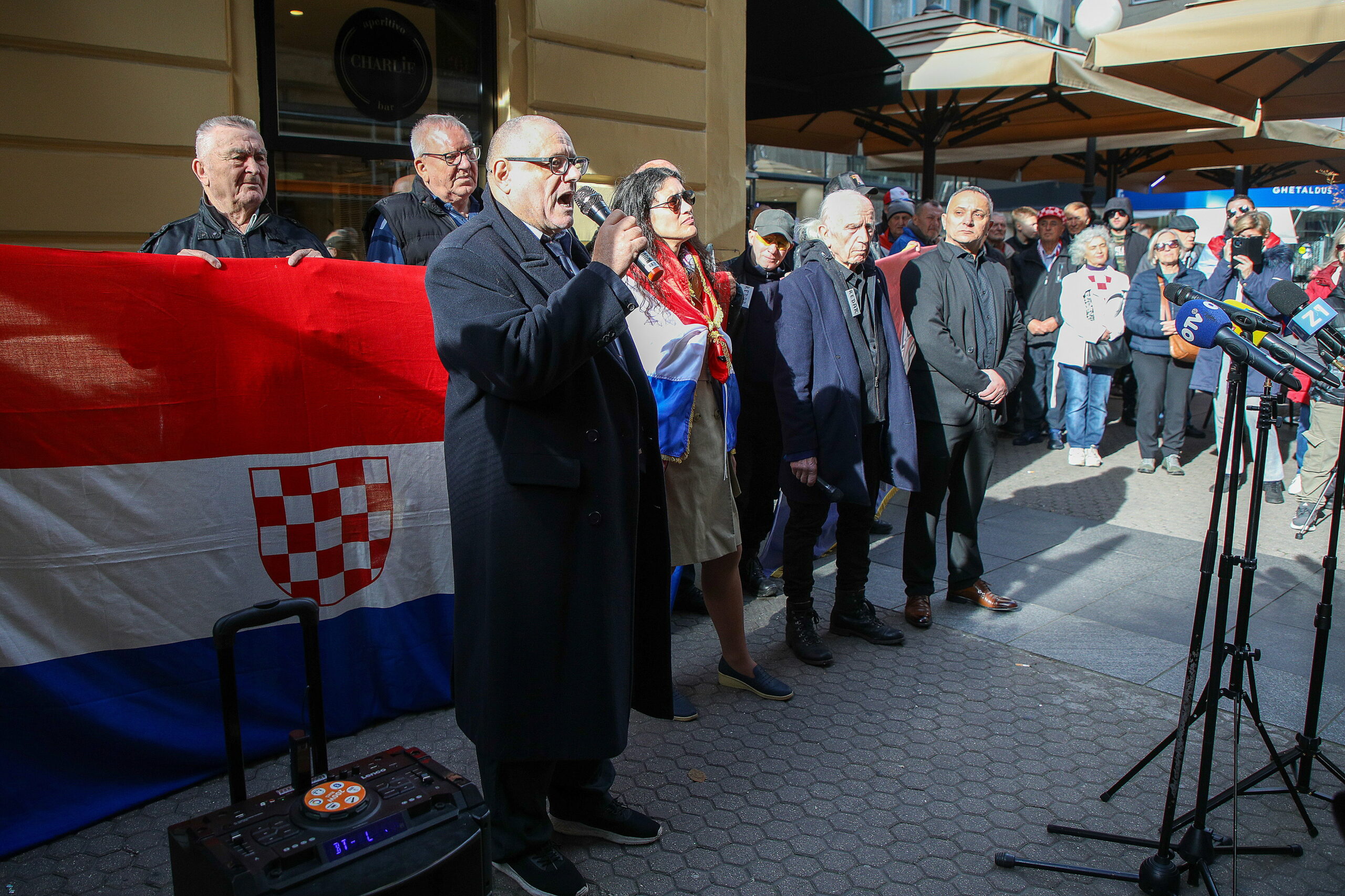 “Pozivamo domoljube na prosvjed! Prosvjed zbog napada na Hrvatsku preko kulture”, rečeno je u pozivu na ovo, pokazalo se maleno okupljanje istomišljenika.