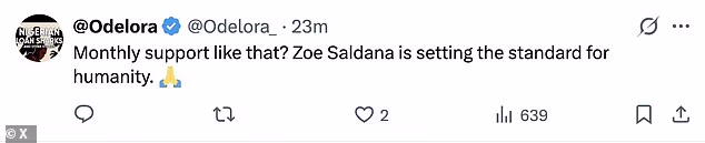 ‘Zoe Saldana donira 2500 dolara obitelji Jamesa Van Der Beeka, MJESEČNO, nakon njegovog gubitka, nešto je najljepše što sam ikada vidio’, rekao je jedan korisnik na X-u (bivši Twitter).