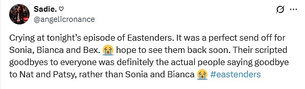 ‘Plačući u večerašnjoj epizodi EastEndersa. Bilo je to savršeno slanje za Soniju, Biancu i Bex. Nadam se da ćemo ih uskoro vidjeti. Njihova scenarija zbogom svima definitivno su bili stvarni ljudi koji su se oprostili od Nat i Patsy, a ne Sonia i Bianca. “