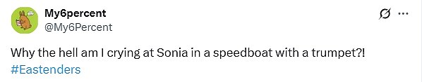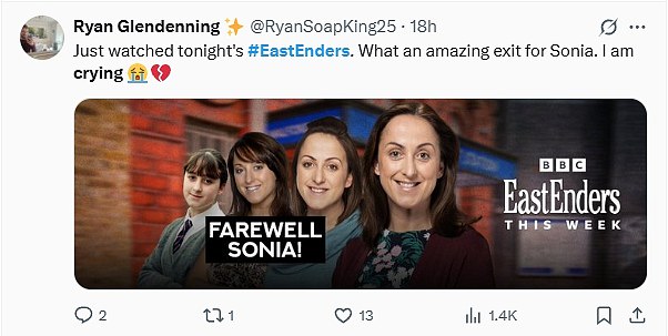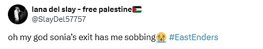 ‘Samo sam gledao večerašnji #eastenders. Kakav nevjerojatan izlaz za Soniju. Plačem. ‘