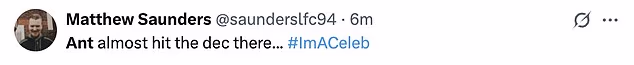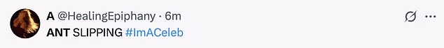 ‘Ant je zamalo udario u dec ondje… #ImACeleb’, ‘ANT KLIZNE’, ‘Je li Ant uživao u svom putovanju na večerašnjem početku #ImACeleb’,