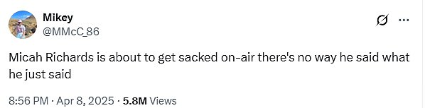 “Micah Richards sprema se otpustiti u eteru, nema načina da je rekao što je upravo rekao,” gledatelj CBS-a objavio je na platformi društvenih medija X.