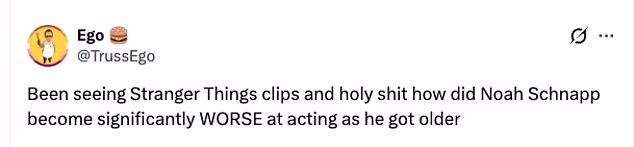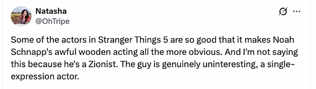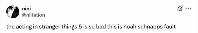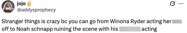 U X su se ljutili: ‘Zašto gluma Noaha Schnappa izgleda kao da je lutka u čarapama?’: ‘Najgora gluma koju sam vidio cijele godine ide Noahu Schnappu’: ‘Gluma Noaha Schanppa je užasna’: ‘Čudnije stvari su lude jer možete ići od Winone Ryder koja glumi guzicu do Noaha Schnappa koji uništava scenu svojim **** *** glumeći’.