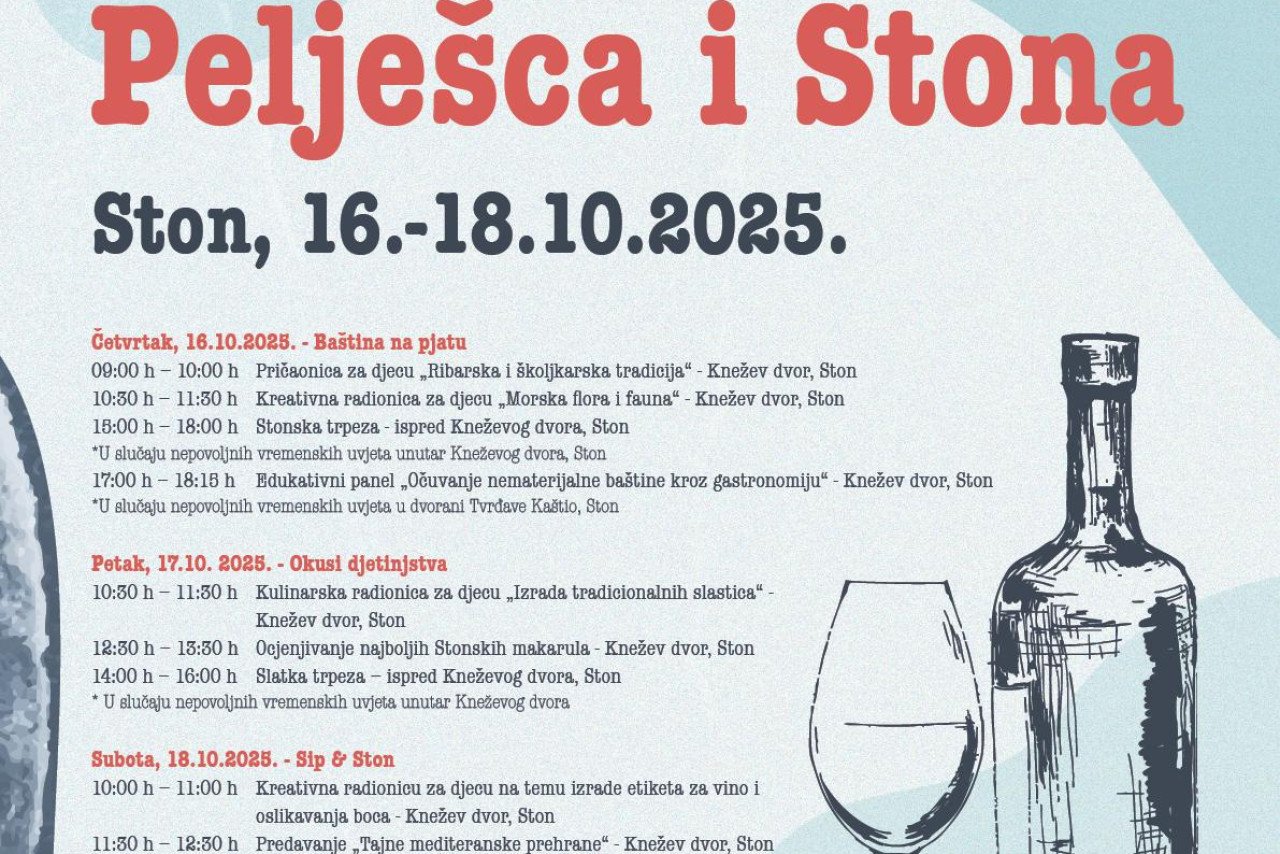 “Okusi i priče Pelješca i Stona“ je trodnevni enogastronomski festival koji spaja tradiciju, lokalne okuse i priče ovoga jedinstvenog kraja. Program obuhvaća radionice za djecu, degustacije autohtonih jela i vina, edukativne panele te druženja s lokalnim poznavateljima čija se baština prenosi s koljena na koljeno.