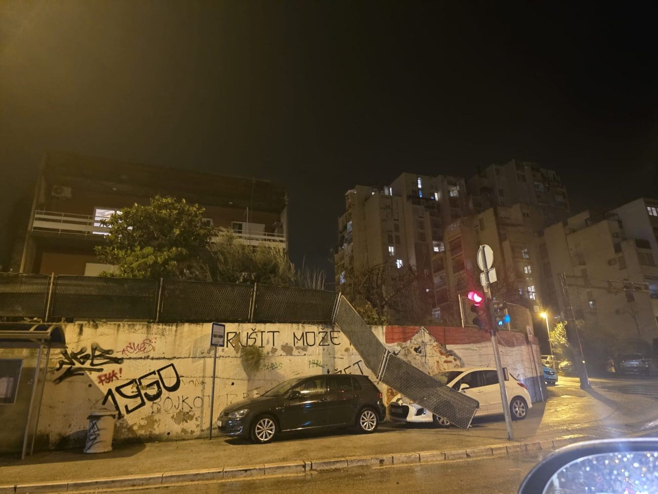 Na fotografiji snimljenoj na toj lokaciji vidi se kako je metalna zaštitna ograda popustila pod naletima vjetra te se nagnula i srušila preko nogostupa, završivši kod parkiranih vozila uz zid. U trenutku snimanja cesta je bila mokra, a promet se odvijao usporeno.