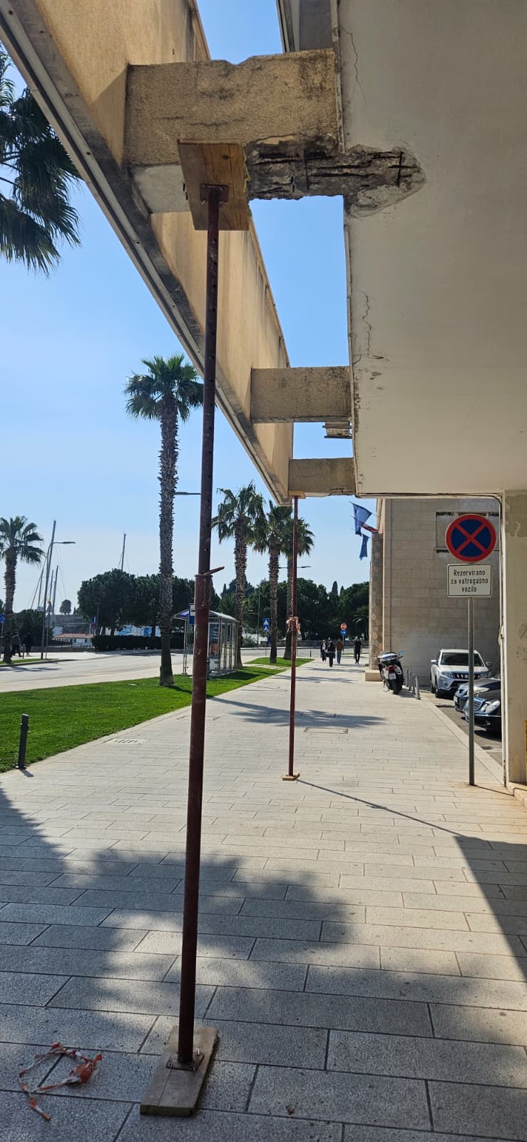 Na jednoj od frekventnijih lokacija u Splitu, ispred zgrade HZZO-a, već mjesecima stoji ozbiljno oštećen dio konstrukcije koji kod prolaznika izaziva zabrinutost. Kako se vidi na fotografiji koju nam je poslao čitatelj, dio betonskog nosača je znatno oštećen, a cijela je konstrukcija privremeno osigurana metalnim podupiračima.