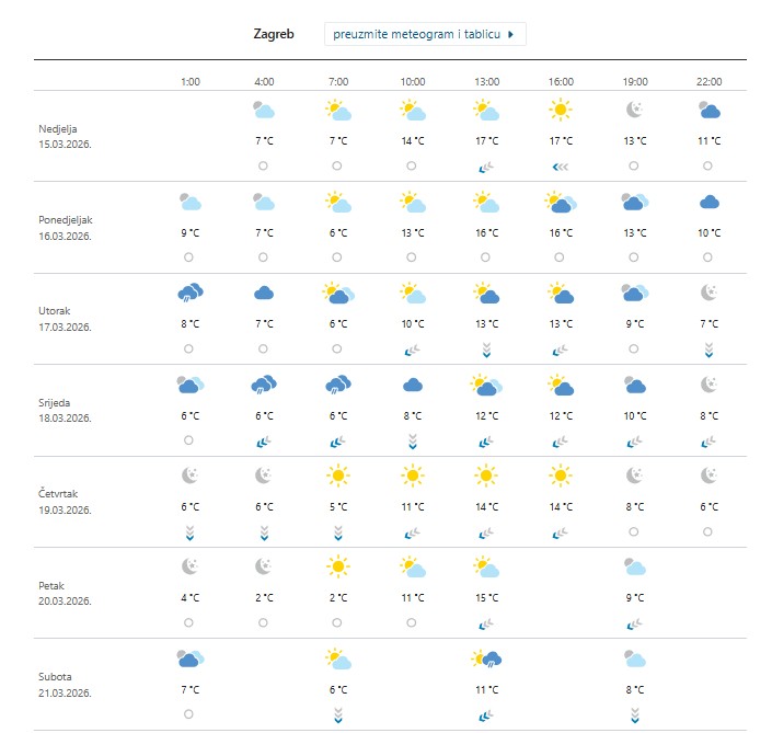 U ponedjeljak pretežno sunčano, poslijepodne i navečer uz postupni porast naoblake mjestimice kiša, lokalno i pljuskovi koji mogu biti praćeni grmljavinom. U noći na utorak kiša će u Gorskoj Hrvatskoj ponegdje prelaziti u susnježicu ili snijeg, ponajprije u višim predjelima. Poslijepodne će zapuhati umjeren, na udare i jak sjeverni i sjeveroistočni vjetar. Na Jadranu slaba do umjerena bura i sjeverozapadni vjetar, a navečer bura u jačanju na jaku, osobito podno Velebita. Najniža temperatura zraka većinom od 1 do 6, na Jadranu od 8 do 12 °C. Najviša dnevna od 15 do 20 °C.