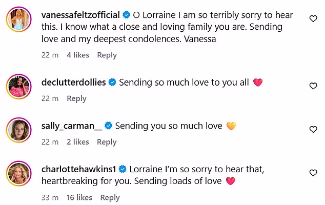 Lorraine je primila nekoliko poruka sućuti od svojih prijatelja i pratitelja, uključujući Vanessu Feltz koja je napisala: ‘Lorraine, jako mi je žao što ovo čujem. Znam kakva ste bliska obitelj puna ljubavi. Šaljem ljubav i najdublju sućut. Vanessa.’