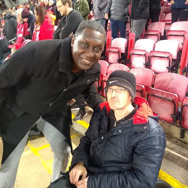 Ovo je Mark Mogan, navijač s invaliditetom Liverpoola (na slici desno s Emile Heskey) koji je uhićen zbog navodnog vikanja rasističkog zlostavljanja kod igrača Bournemouth -a Antoine Semenyo