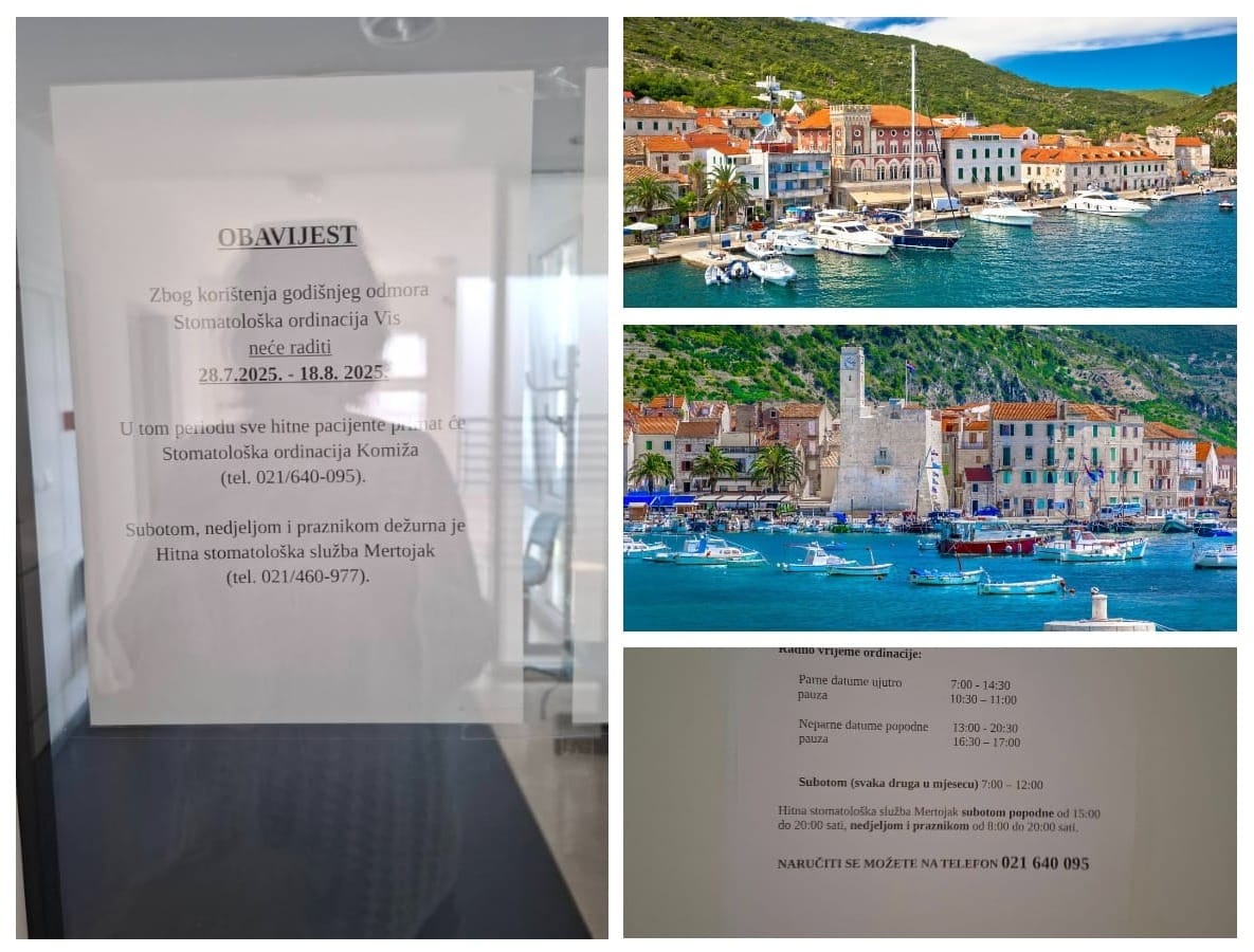 – Na Visu zubarica koristi godišnji odmor do 18.08., pa se u to vrijeme viški hitni pacijenti upućuju u stomatološku ordinaciju Komiža. E, tu počinju problemi! Jer na vratima ordinacije stomatologa u Komiži piše da radi. A ne radi. A nema obavijesti da ne radi. Valjda mi, koje boli zub, nismo dostojni te obavijesti! Čekam zubara 13.08. čak četiri sata, jer piše da radi do 20.30. Čekam ga i 14.08. ujutro, jer piše da radi ujutro, ali opet ga nema. Zaključano. Bez obavijesti o odsutnosti, o korištenju godišnjeg odmora, ma bez ikakve obavijesti! Ljudi šize! A sve to u vremenu pune sezone – piše ljuta Višanka.