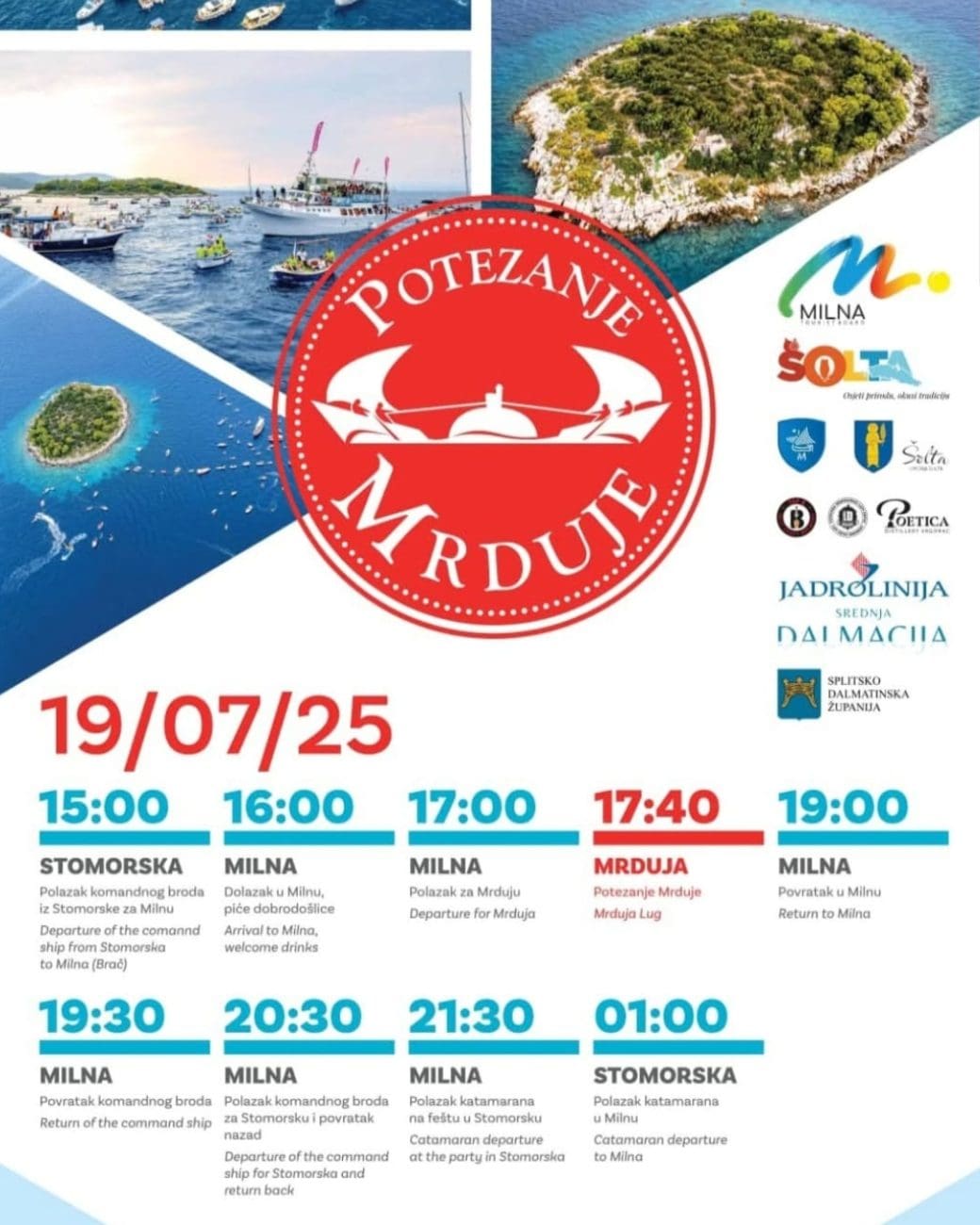 Organizatori ove godine najavljuju posebno bogat program, a za sve one koji nemaju vlastite brodice osigurani su veći brodovi koji će iz Splita prevoziti posjetitelje do mjesta događanja. Na rivi u Milni i Stomorskoj moći će se kupiti suveniri i službene majice Mrduje 2025, dok će navečer na obje strane kanala koncerti i zabavni program dodatno upotpuniti doživljaj.