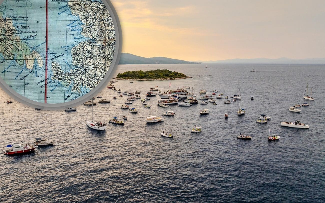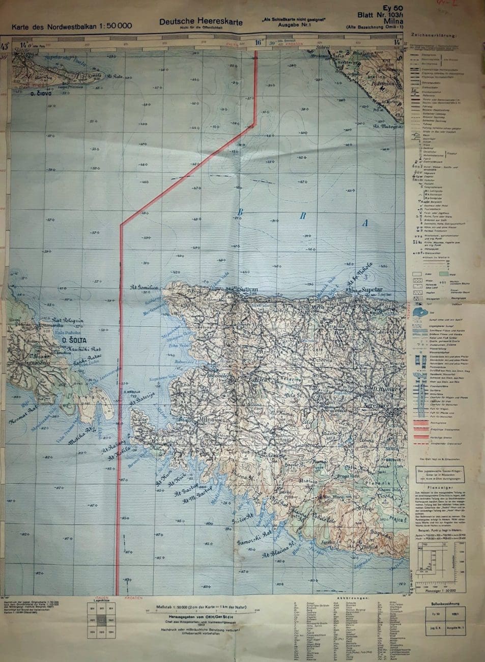 Jedna naša čitateljica s Brača poslala je zanimljivu kartu iz daleke 1943. godine. Radi se o karti koja prikazuje granice koje su odredile tadašnje okupatorske države Njemačka i Italija. Tako je granica išla točno između Brača i Šolte, a Mrduja je tada pripadala otoku Braču.