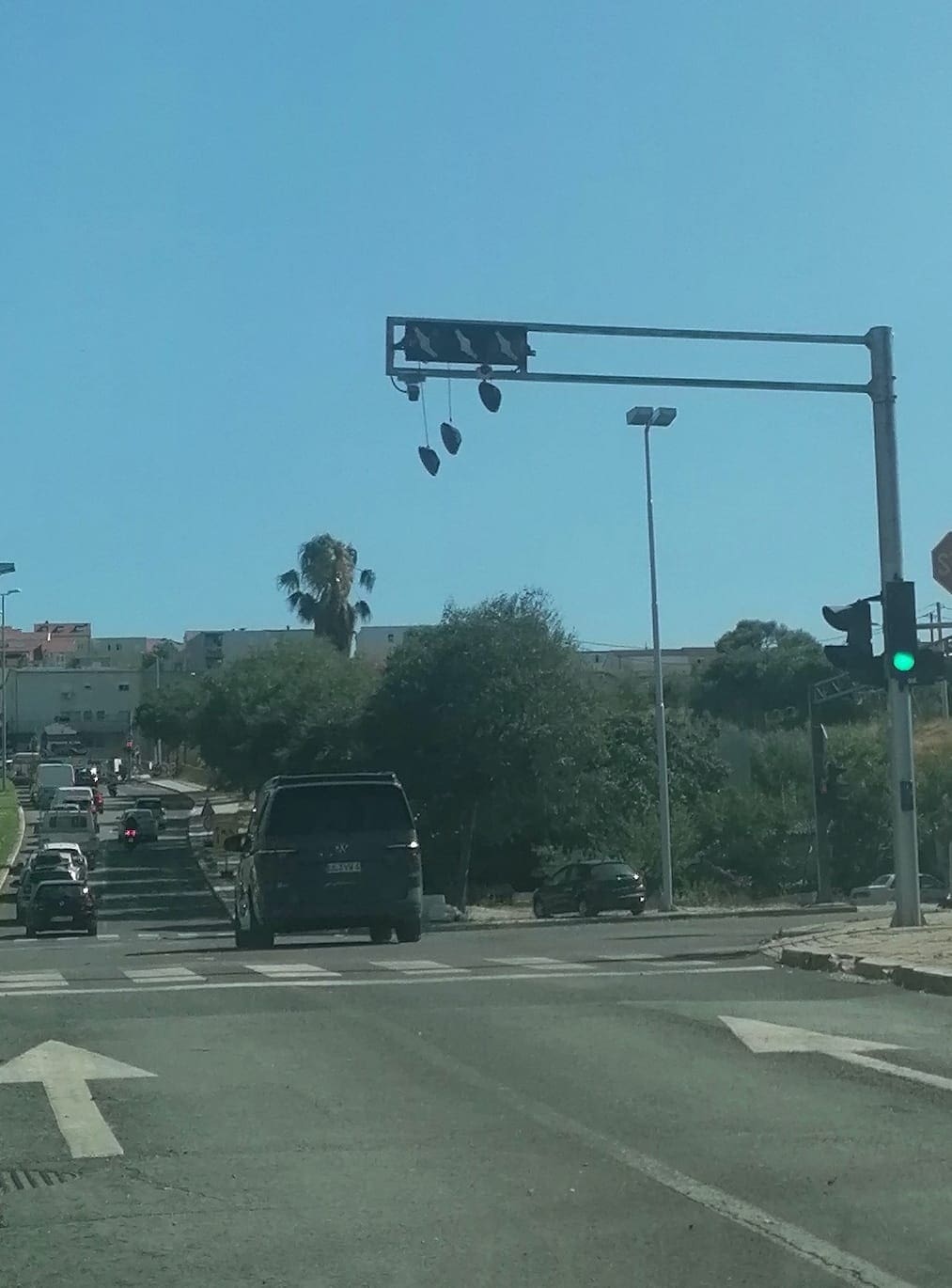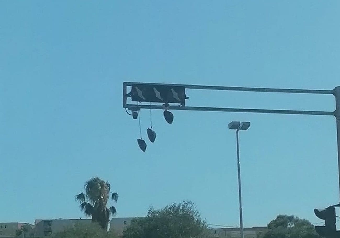 Fotografija snimljena u posljepodnevnim satima prikazuje semafor čija su svjetla napola otkinuta i vise s metalnog nosača iznad raskrižja. Unatoč vidljivom oštećenju, semafor još uvijek funkcionira i daje svjetlosne signale vozačima, no pitanje je koliko dugo će ostati u funkciji, ako se ne sanira šteta.
