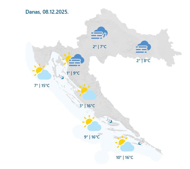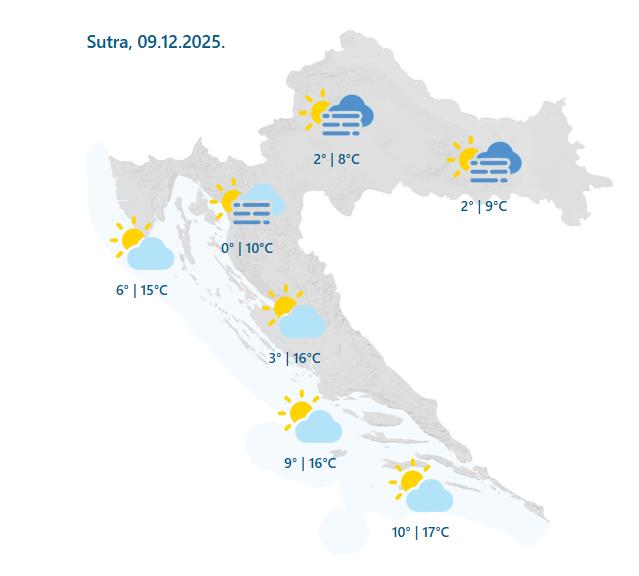 Na Jadranu te u unutrašnjosti Istre i Dalmacije pretežno sunčano. Na kopnu vjetar slab, a na Jadranu do umjerena bura i sjeverozapadnjak.
