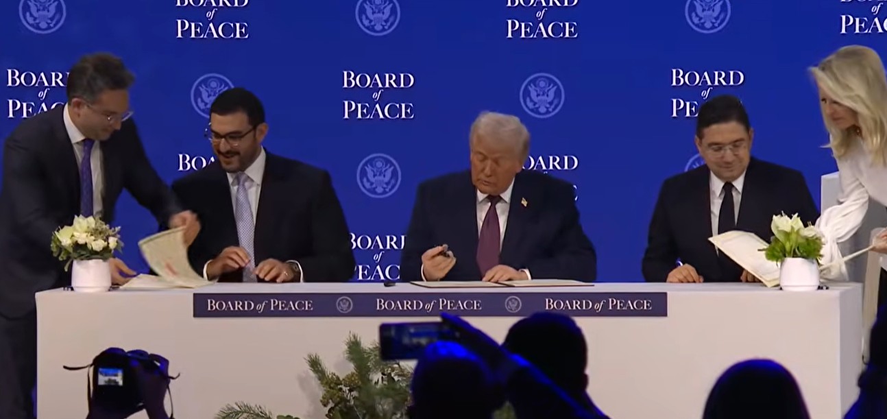 Nakon što je završio svoj govor, Donald Trump poziva predstavnike Bahreina i Maroka na pozornicu da „dovedu Odbor za mir u punu snagu“. Oni stavljaju pero na papir, potvrđujući povelju Odbora za mir.