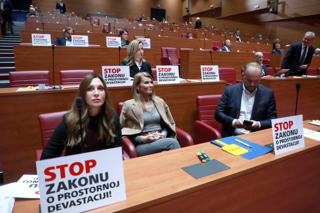 Lijeva oporba pozvala je vladajuće da zakone povuku te najavila da će se, izglasaju li ih, prvo obratiti Ustavnom sudu, a bude li trebalo, ići i na referendum. Najoštrija je bila Sandra Benčić koja je Ustavnom sudu postavila rok od tri mjeseca da se izjasni o spornim zakonima, najavljujući u suprotnom pokretanje referenduma kojim će rušiti i zakon i Vladu, što vrlo vjerojatno i jest krajnji cilj lijeve opozicije. Benčić se pridružila i SDP-ova Jasenka Auguštan Pentek, proglasivši Zakon o prostornom uređenju zloglasnim, no nju je HDZ diskreditirao aferom s dodjelom božićnica odnosno bonova od 50 eura umirovljenicima u Zlataru gdje je gradonačelnica.