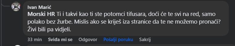 “Morski HR, Jedva čekam upoznavanje. A saznati ću ja adresu tvoju i cijenjeno ime. Nećeš se izvući bez posljedica, u to budi siguran. Neće ti pomoći ni to što si hrabar preko stranice, svi vi tifusari ste hrabri na internetu, kad se upoznamo vidjet ćemo onda tu hrabrost”