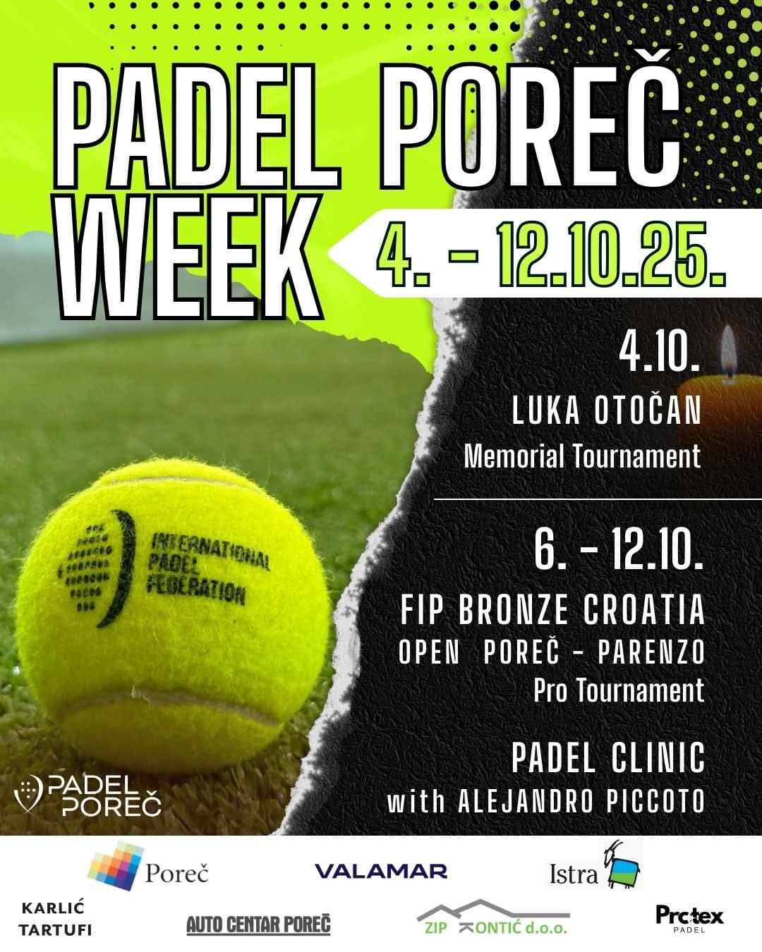 Od 4. do 12. listopada na terenima Padel Poreč Centra održava se Padel Poreč Week – sportsko događanje koje okuplja zaljubljenike u ovaj sve popularniji sport. Događanje otvara u subotu, 4. listopada, humanitarni turnir Memorijal Luka Otočan, s početkom u 10 sati. Kotizacija je dobrovoljna, a sva sredstva bit će donirana u humanitarne svrhe. Prijave su moguće putem Wansport aplikacije ili WhatsAppa na broj +385 91 6024412. Glavni turnir održava se od 6. do 12. listopada – FIP BRONCE CROATIA 2025, prestižni profesionalni turnir s nagradnim fondom od 10.000 eura, koji u Poreč dovodi vrhunske svjetske igrače i nezaboravne padel mečeve. Pridružite se i uživajte u vrhunskim mečevima, energiji sporta i zajedništvu!