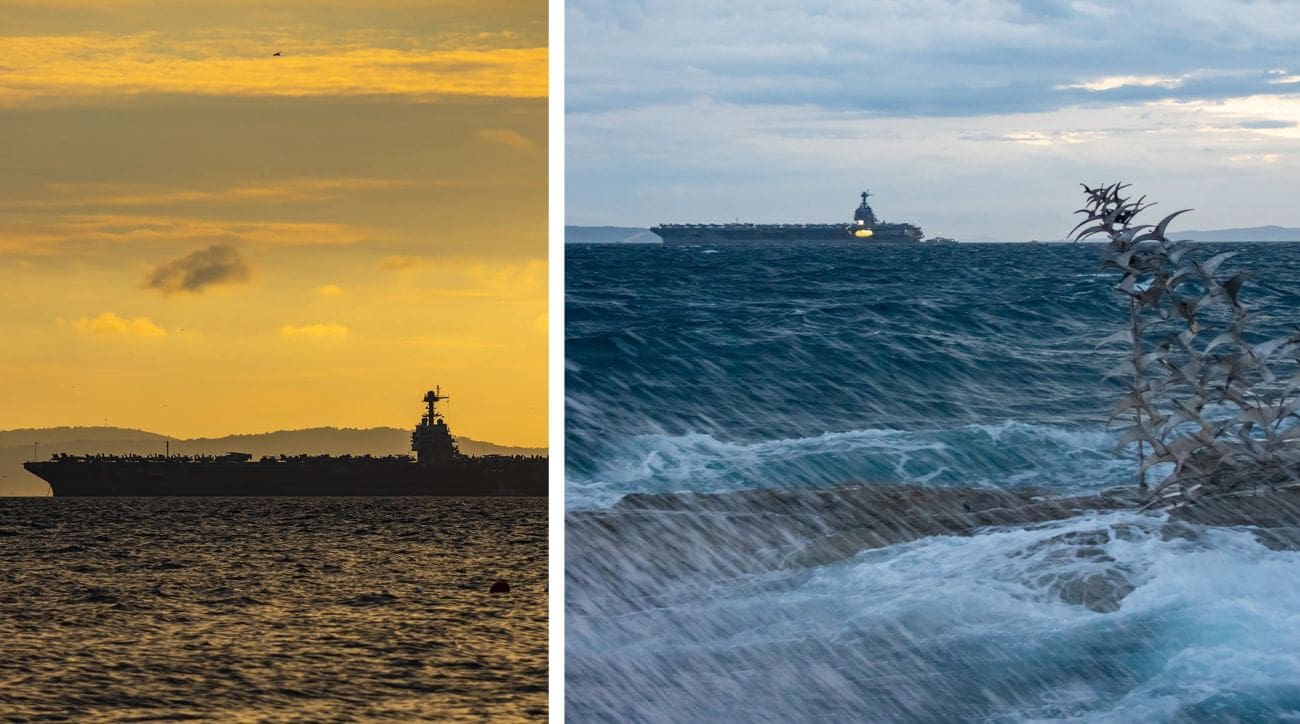 Od zlatnih zalazaka sunca do juga koji svom snagom udara o obalu, USS Gerald R. Ford doživljava sve faze splitske jeseni. Njegova golema paluba i moćne konture stvaraju upečatljiv prizor u izmjenama svjetla i vremenskih uvjeta od mirnih, bakrenih večeri do vjetrovitih dana kada valovi zapljuskuju obalu.