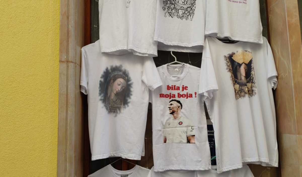 U jednom od dućana u Sinju uz majice s likom Gospe Sinjske prodaju se i majice s likom Ivana Perišića.