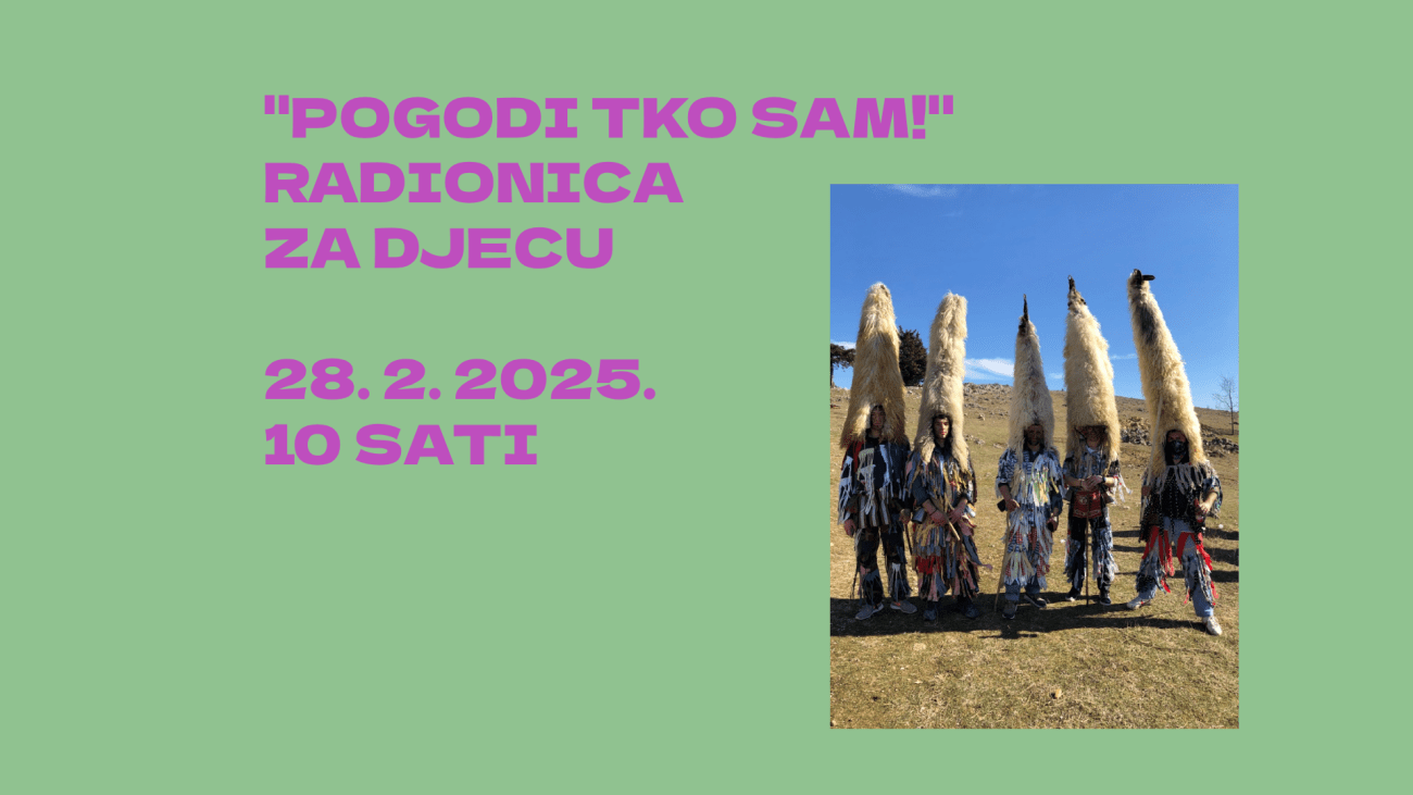 Nakon razgledavanja izložbe „Orilo, gorilo, ić’ se mora” i upoznavanja sa zanimljivostima pokladnih običaja Splitsko-dalmatinske županije, slijedi muzejska radionica „Pogodi tko sam” na kojoj će djeca izrađivati svoje maske. Saznat ćemo i kada počinju poklade, od kojeg materijala su ljudi prije izrađivali maske, u koje likove su se maškarali i još puno toga.