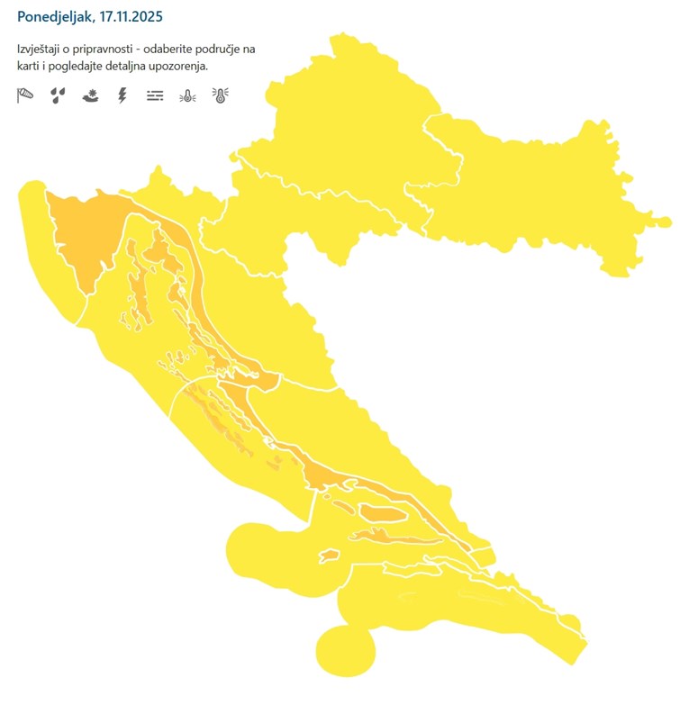 Za sutra je za cijelu zemlju na snazi upozorenje Meteoalarma zbog jakog vjetra te moguće obilne kiše i grmljavinskog nevremena.