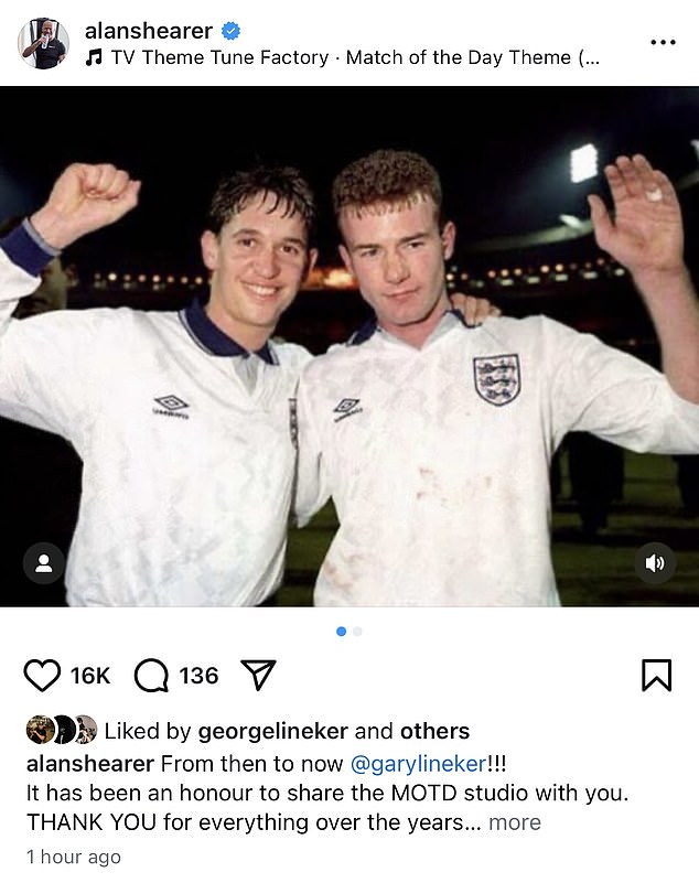 Ranije tog dana, Shearer je podijelio fotografiju sebe i linekera tijekom njihovih dana u Engleskoj, a drugu od njih zajedno u nedjelju.