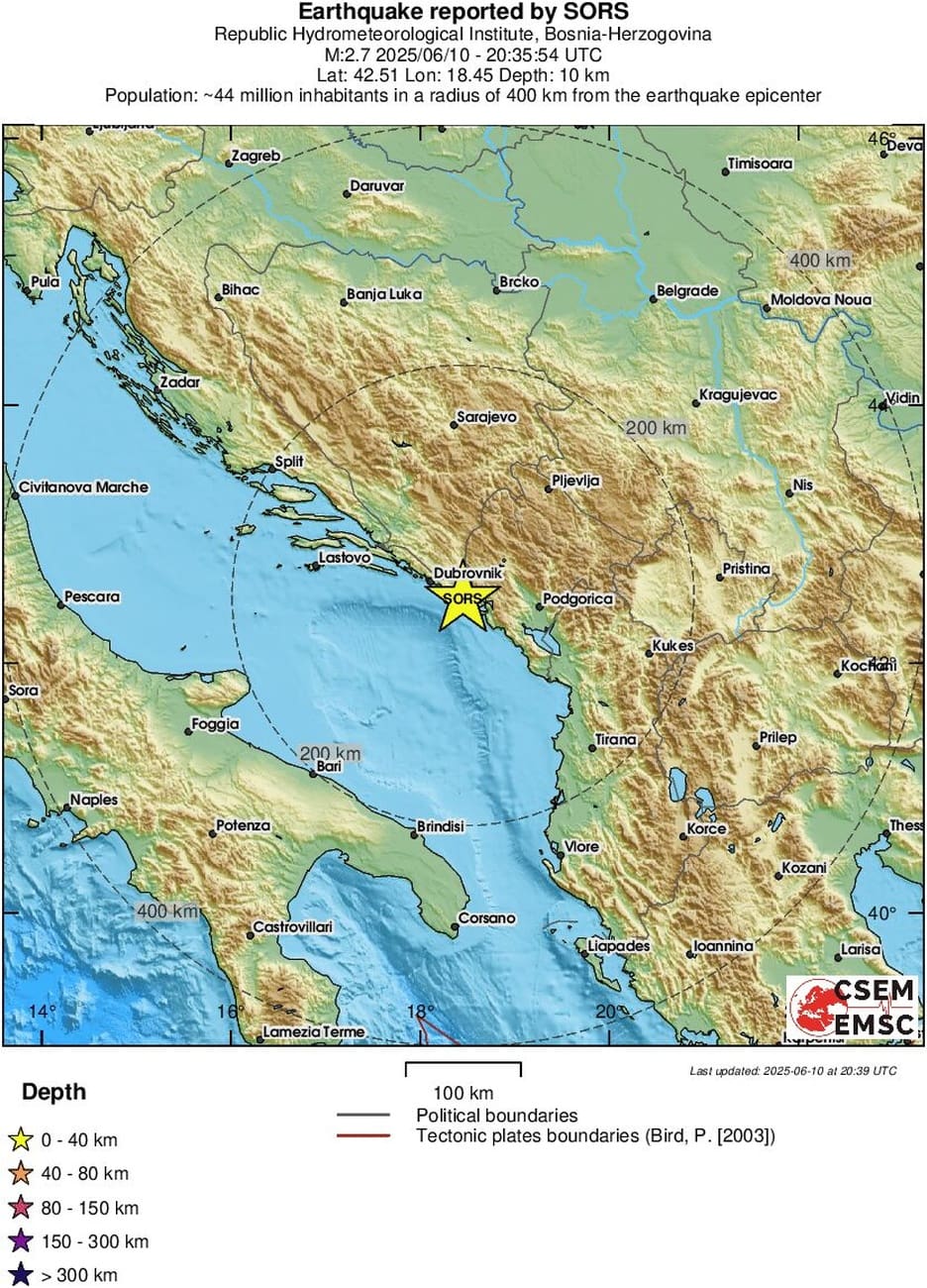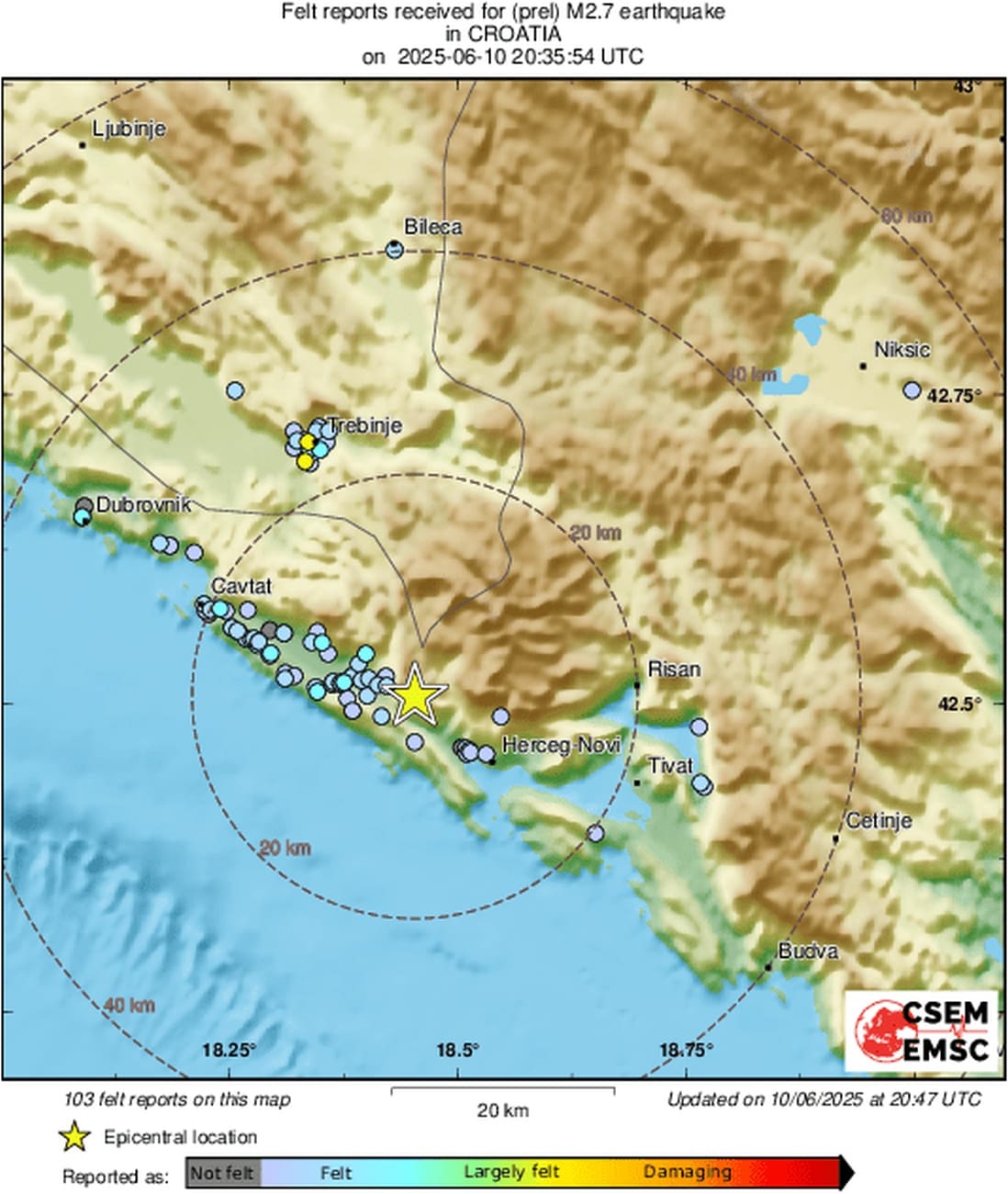 Prema podacima EMSC-a, magnituda potresa je bila 2.7 prema Richteru, a epicentar oko Snježnice u Konavlima.