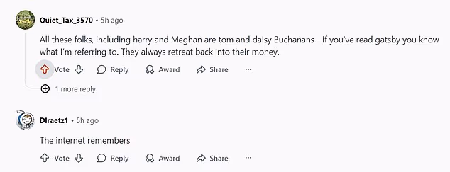 Napisali su: ‘Svi ovi ljudi, uključujući Harryja i Meghan su Tom i Daisy Buchanans – ako ste čitali Gatsbyja znate na što mislim. Uvijek se povuku natrag u svoj novac.’