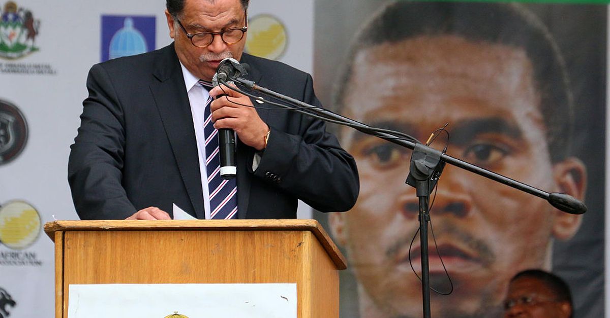 DURBAN, JUŽNA AFRIKA – 1. STUDENOGA: Predsjednik SAFA-e Danny Jordan govori tijekom pogrebne službe preminulog Senza Meyiwe (kapetana južnoafričke reprezentacije i Orlando Piratesa) na stadionu Moses Mabhida 1. studenog 2014. u Durbanu, Južnoafrička Republika. Senzo Meyiwa je ubijen iz vatrenog oružja u Vosloorusu na East Randu prošle nedjelje, 26. listopada 2014. (Fotografija Anesh Debiky/Gallo Images/Getty Images)