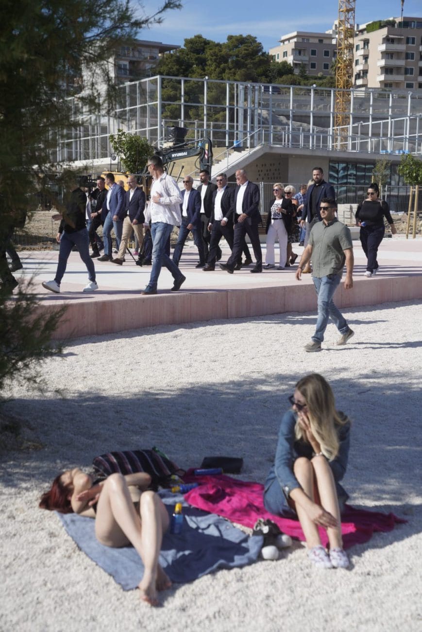 A sunčan dan je privukao i prve kupače na splitsku plažu. Tako predsjednik nije morao gledati samo u radove već i kristalno more i naravno, najlipše žene na svitu.