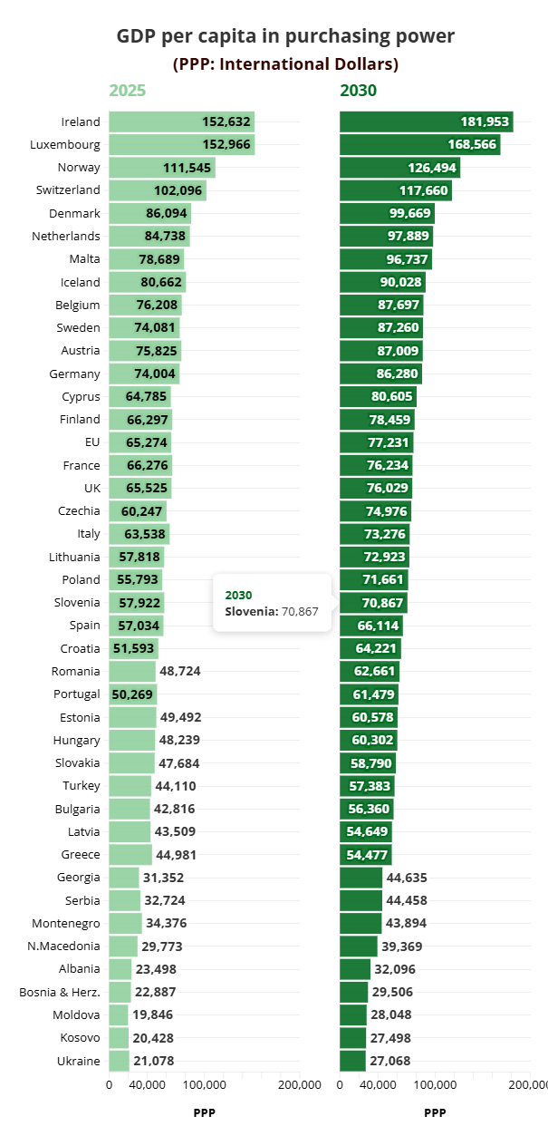 Projekcije MMF-a pokazuju značajan porast BDP-a po glavi stanovnika u eurima diljem Europe do 2030., ali se rangiranje ne mijenja značajno u smislu kupovne moći.