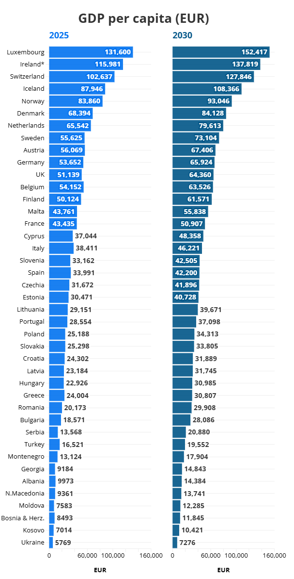 Na vrhu tablice, razlike su znatne. Irska i Luksemburg su znatno iznimne, s projiciranim BDP-om po glavi stanovnika za 2030. od 168.000 odnosno 154.000 EUR. Slijede Norveška i Švicarska, a očekuje se da će obje premašiti 106.000 eura do 2030. S druge strane grčki BDP per capita je otprilike 50.000 eura najniži među članicama EU. Za Hrvatsku se očekuje rast na 64 000 eura BDP per capita (sa sadašnjih 51 000).