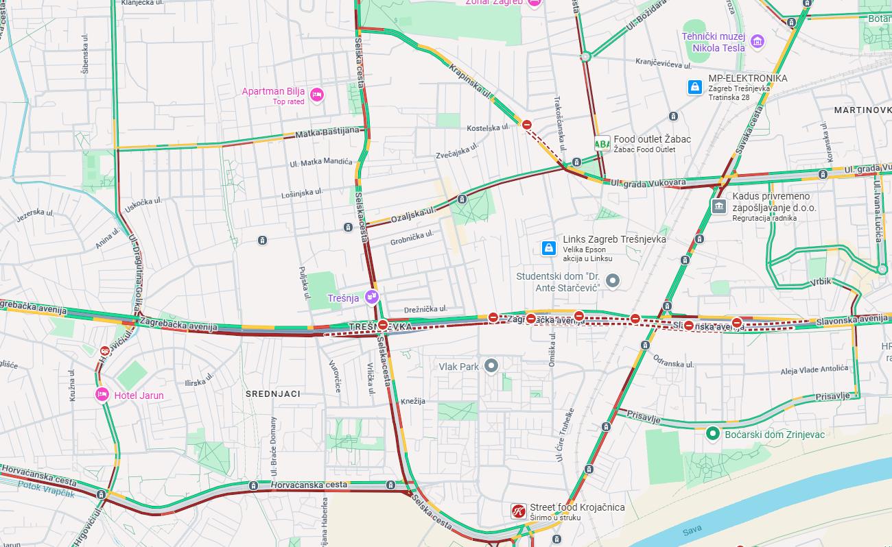 Na google kartama vidi se da je gužva u brojnim ulicama. U crvenom je Slavonska, Selska, Horvaćanska, Zagrebačka avenija, Ozaljska.