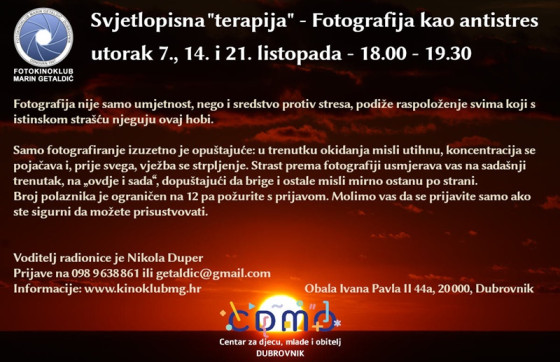U tri susreta polaznici će fotografirati, razgovarati i analizirati fotografije. Dobrodošli su početnici i iskusni; broj mjesta je ograničen na 12, prijava je obavezna. ‘Molimo da se prijavite samo ako ste sigurni da možete sudjelovati’, poručuje organizator. E mail je getaldic@gmail.com, a kontakt telefon 098 9638861