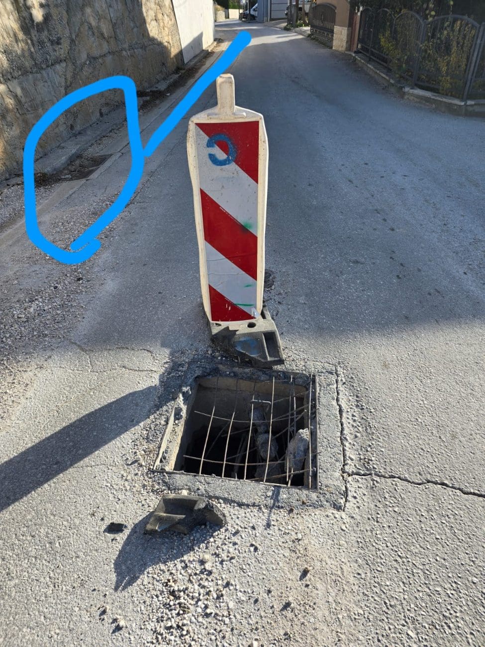 Čitatelj iz Žrnovnice, iz Mosorske ulice u naselju Korešnica, javio nam se upozoravajući na ozbiljan komunalni problem koji već više od 15 dana stoji neriješen. Prema njegovim riječima, na sredini prometnice nalazi se velika rupa nastala propadanjem poklopca šahta. Nadležne službe, tvrdi, izašle su na teren i postavile znak upozorenja, no sanacija do danas nije izvedena.