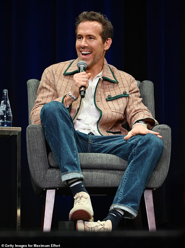Ryanov najbolji prijatelj Hugh Jackman prisustvovao je Q&A u srijedu. Zvijezda Wolverine ušla je na pozornicu noseći bend-pomoć na licu (na slici)