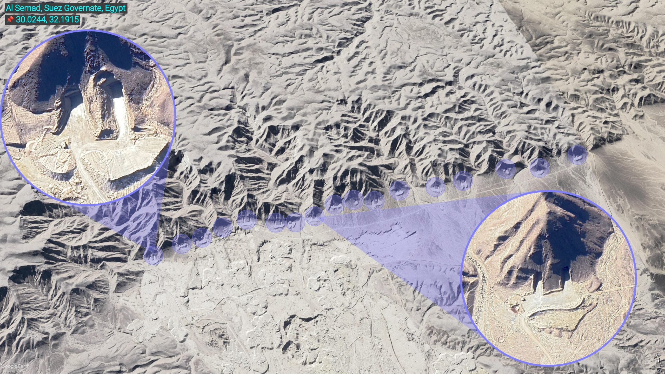 Jedan od kompleksa nalazi se otprilike na pola puta između gradova Sueza i Kaira, samo 70 kilometara od novog administrativnog glavnog grada Egipta i prostranog kompleksa egipatskog Ministarstva obrane. Drugi kompleks leži na Sinajskom poluotoku, okružen brojnim vojnim instalacijama, uključujući tri zračne baze. Dok točna svrha ovih podzemnih objekata ostaje nejasna, Izrael sumnja da bi oni na Sinajskom poluotoku mogli služiti kao skladišta projektila.