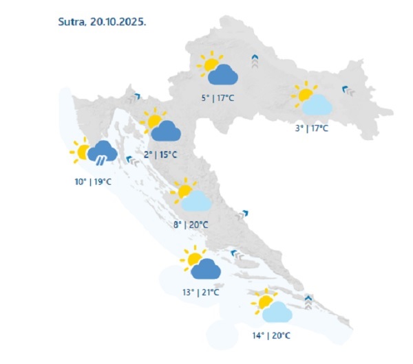 Prema novoj vremenskoj prognozi Dhmz-a u ponedjeljak se očekuje postupan porast naoblake koji dolazi sa zapada, u drugom dijelu dana na sjevernom Jadranu i u Gorskom kotaru moguća je kiša.